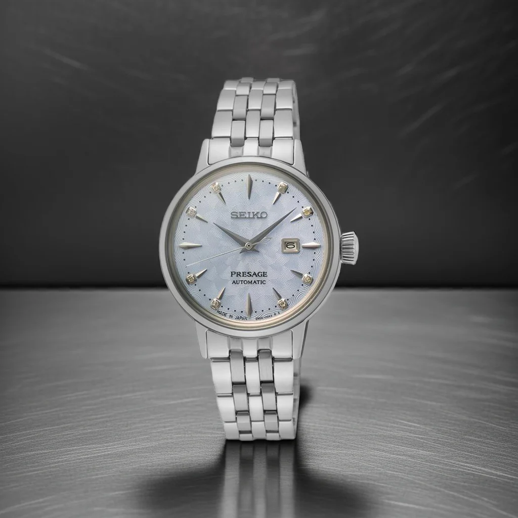 The new Presage Cocktail SRE007J1 is inspired by the Sky Diving cocktail and with the light texture of its dial recalls the blue of the sky. The dial is slim and delicate with a neat finish. Several layers of a clear coat are applied to the dial before being polished for a dazzling effect. Eight diamonds placed at the indexes add a touch of luxury and glamor to the wrist.