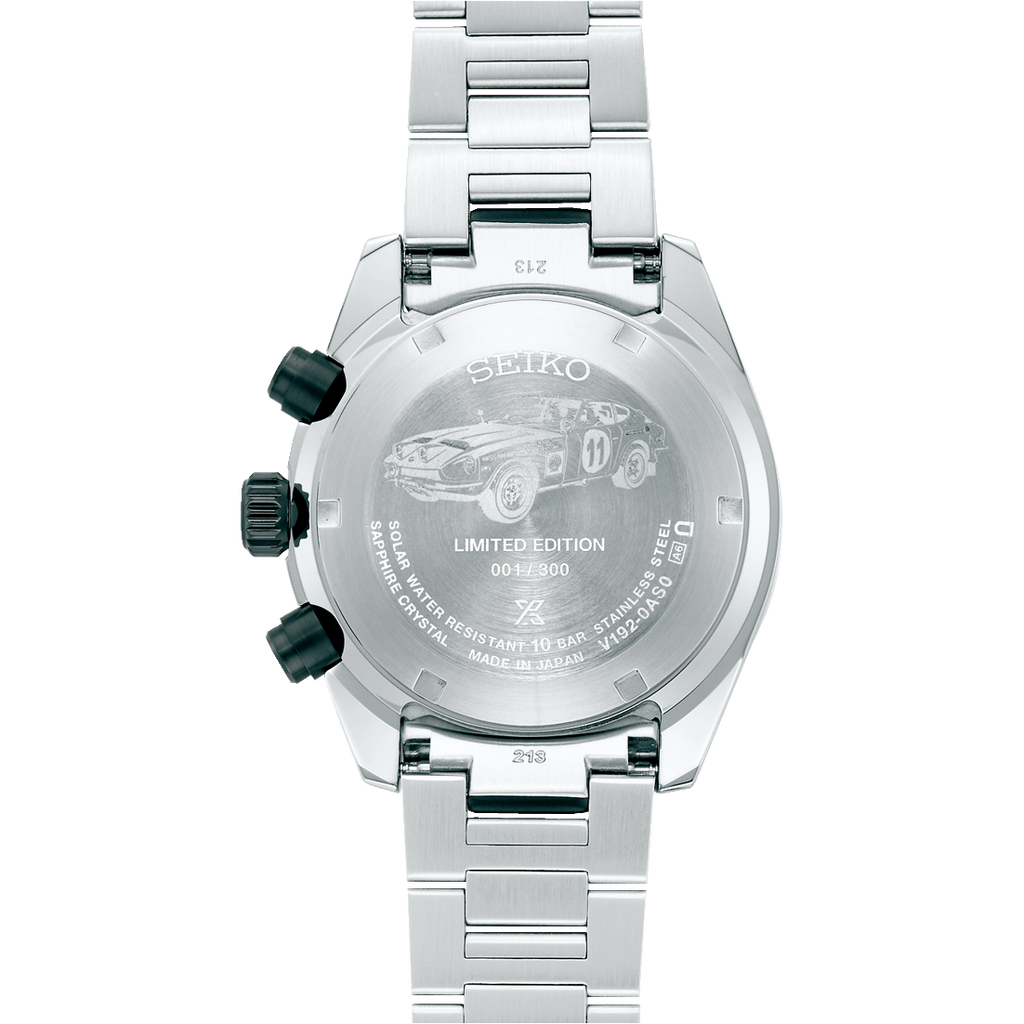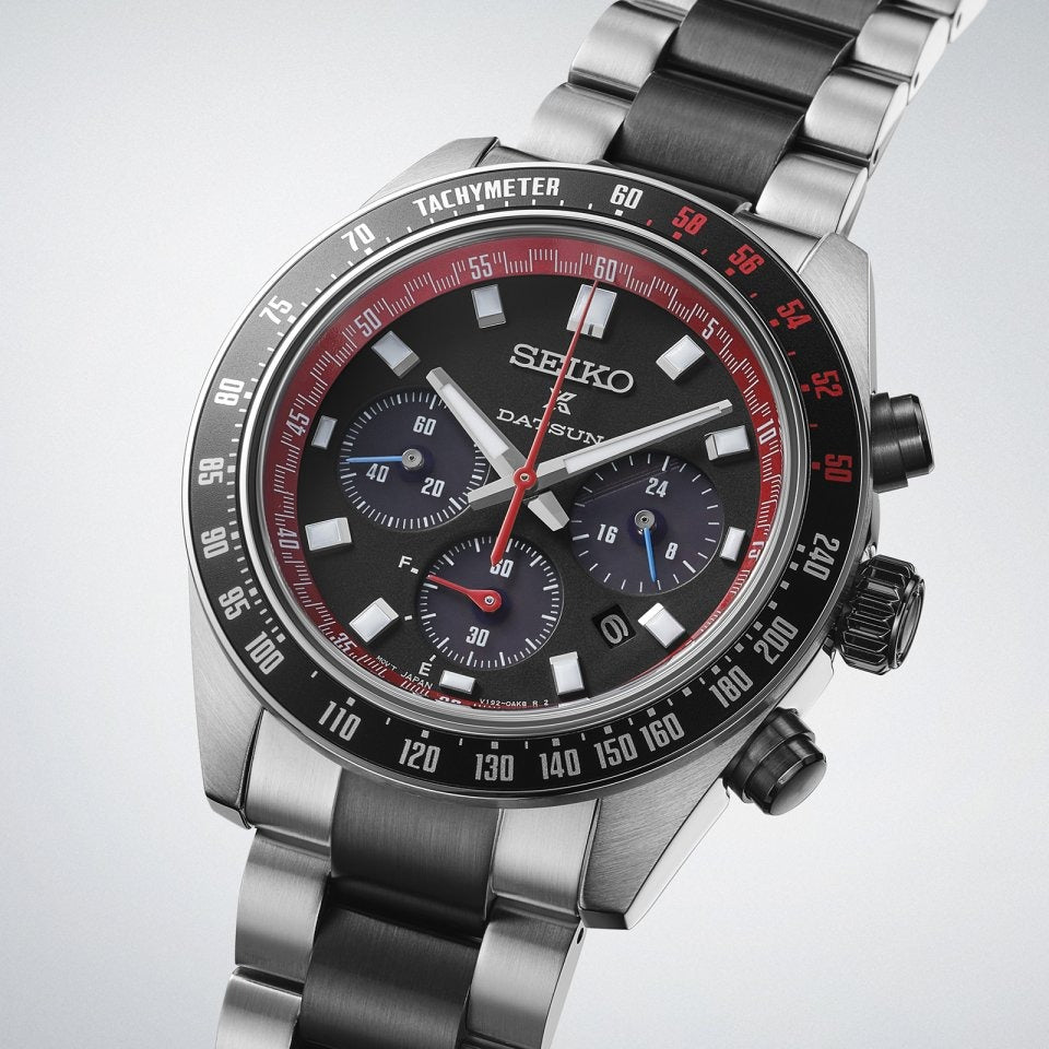 is a limited-edition watch, with only 300 pieces produced exclusively for the Japanese market. First introduced in 1969, the 'Speedtimer' was a significant milestone in Seiko's watchmaking heritage. 'Datsun', Nissan Motor Corporation's leading Japanese sports car brand, also launched that same year. In 1971, the Datsun 240Z, also known as the Fairlady Z, adorned with the Seiko sponsorship logo, won the East African Safari Off-Road Race, one of the world's most grueling races. The design draws inspiration from the original DATSUN 240Z race car, with the color scheme, dashboard font, and DATSUN logo on the dial.