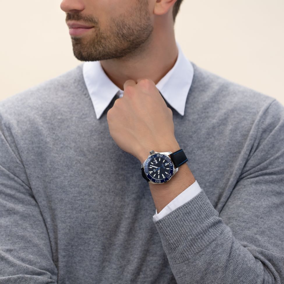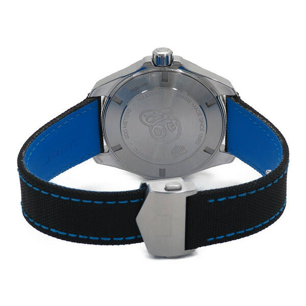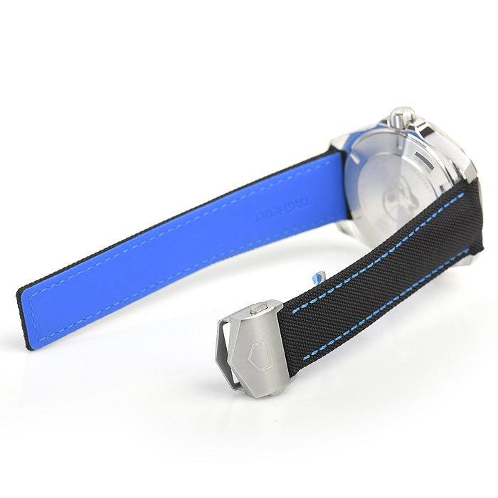 TAG Heuer Aquaracer Automatic 43 mm watch. Model reference: WAY201C.FC6395. Stainless steel case. Black dial. Automatic movement. Black fabric strap with blue stitching. Swiss made. The watch comes in the original packaging, with a set of documents and 2 years warranty.