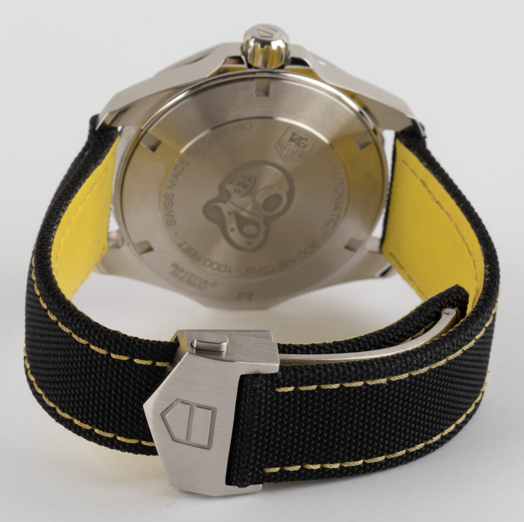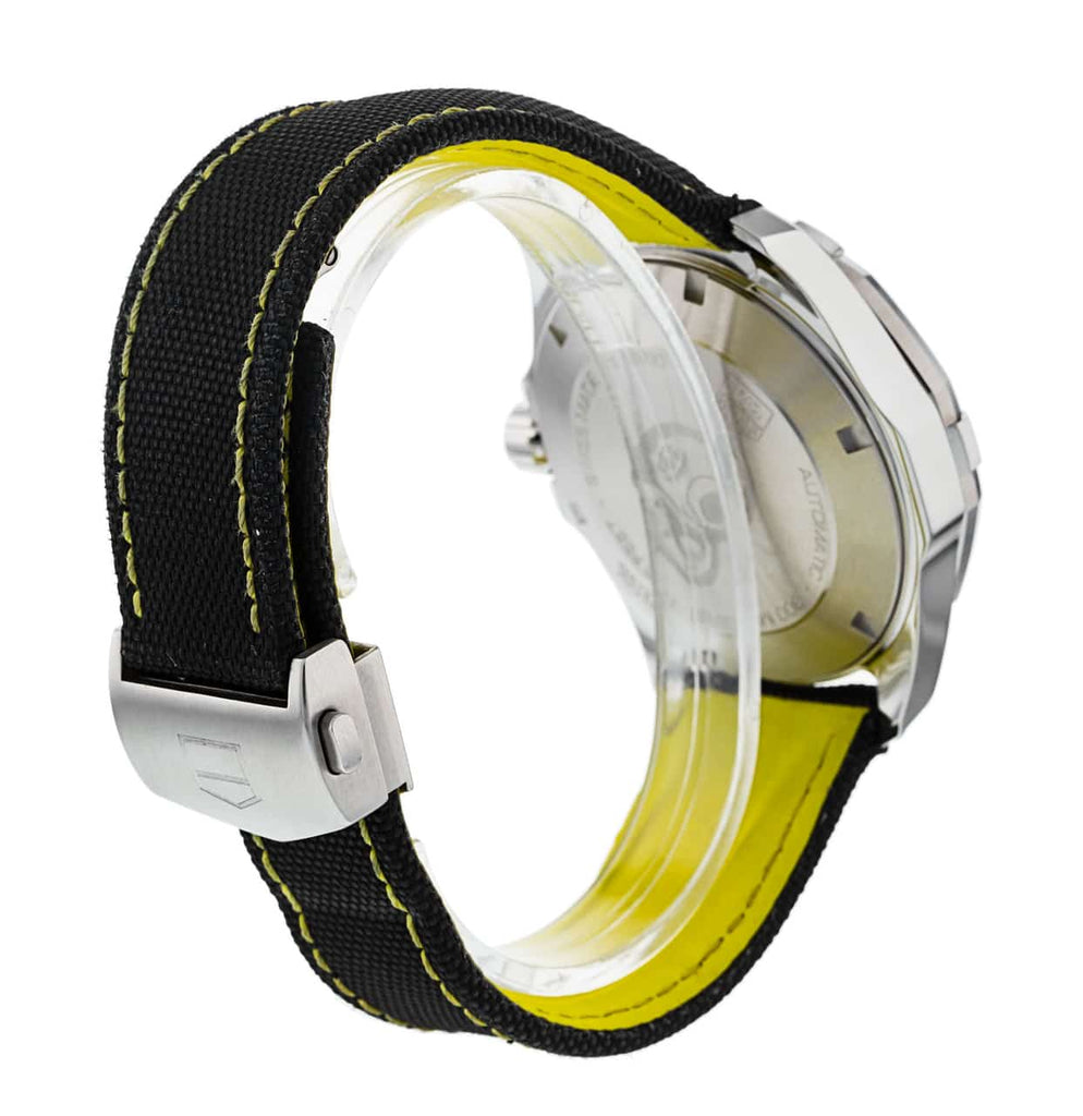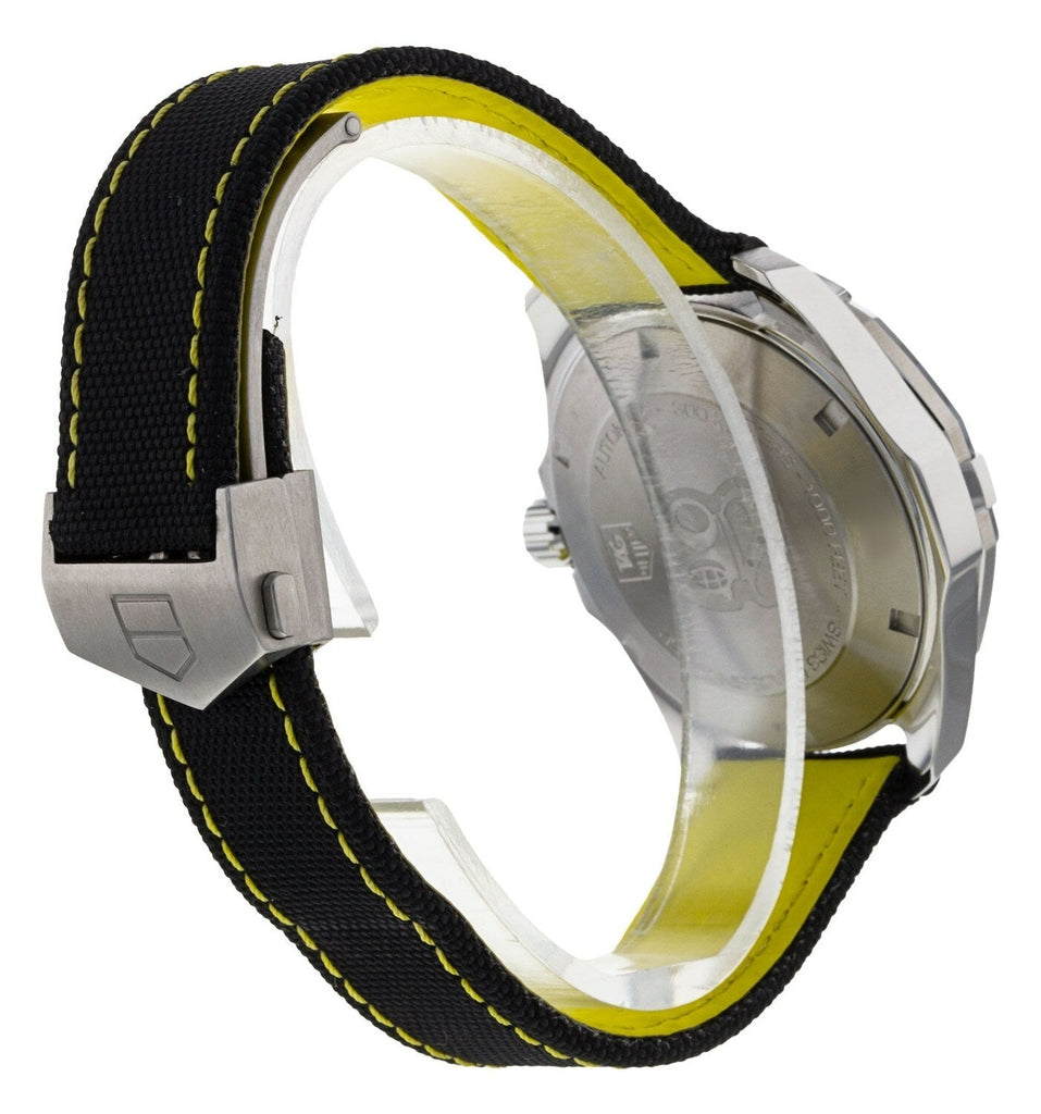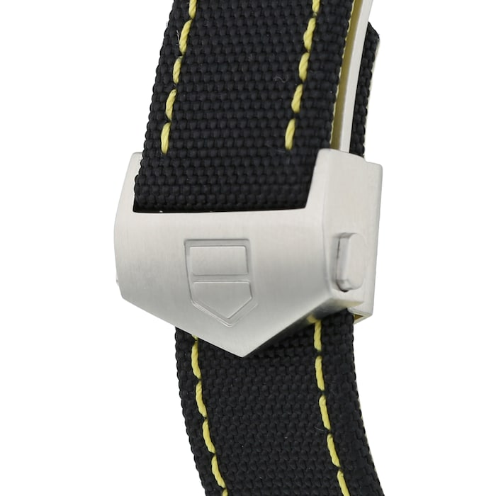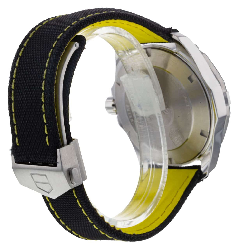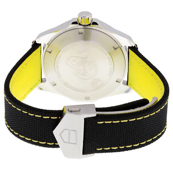 The Tag Heuer Aquaracer WAY211A.FC6362 features a stunning black textured dial with chrome hands and hour markers that are filled with luminous material. There is some yellow and white writing on the dial and also some yellow at the end of the second hand. The face is protected by a sapphire crystal and has a magnifier over the date display at 3’oclock. The watch has a black bezel with stainless steel case and a black nylon band with yellow stitching that matches the colours on the dial.