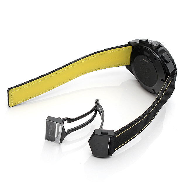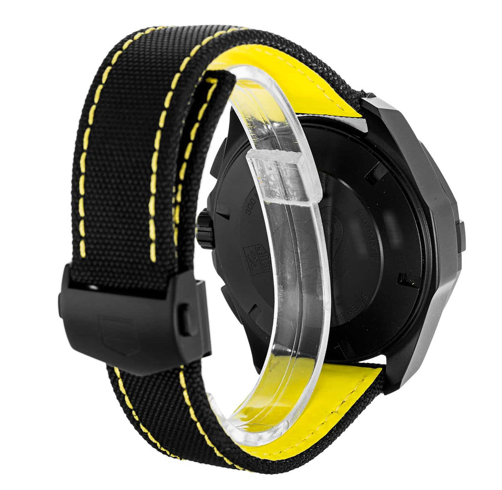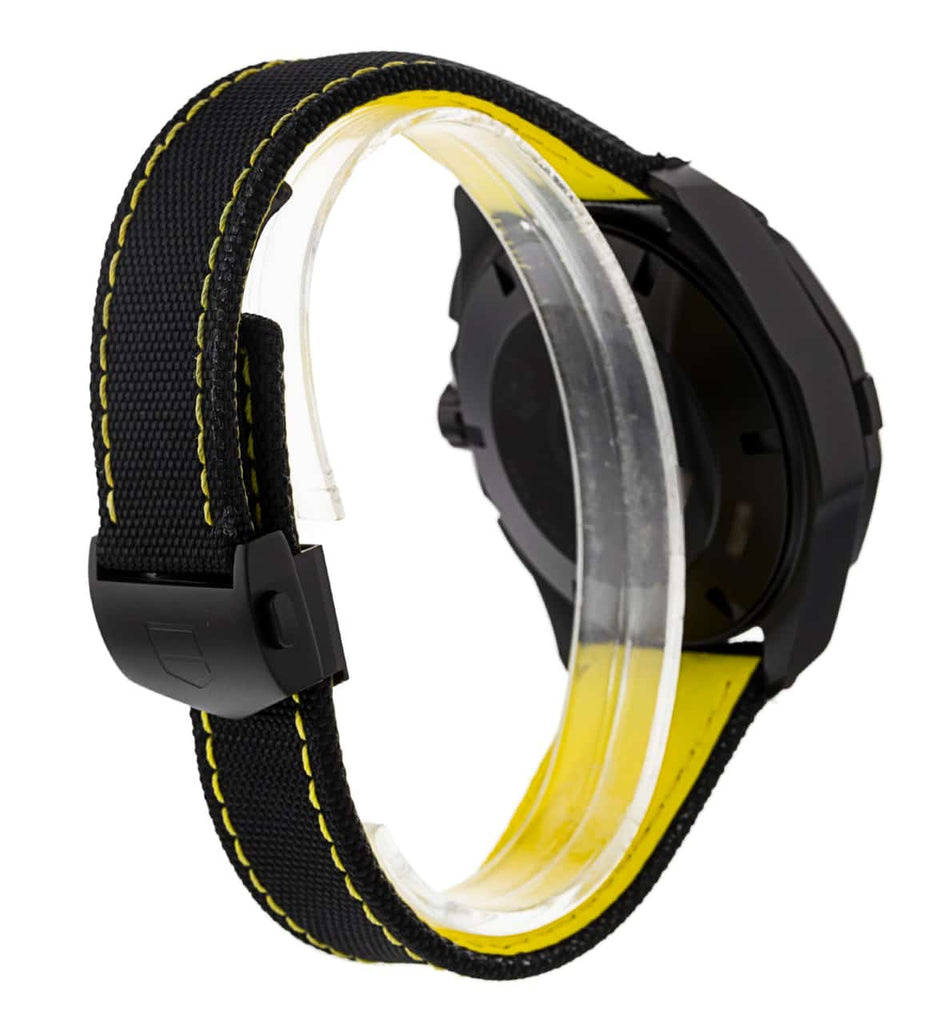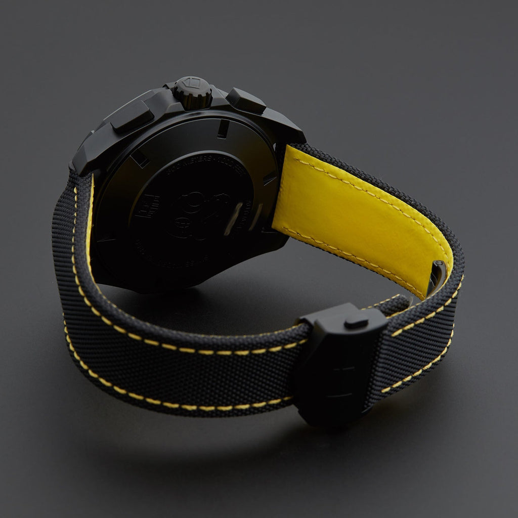 A black nylon strap with eye-catching yellow stitching and lining completes the look.