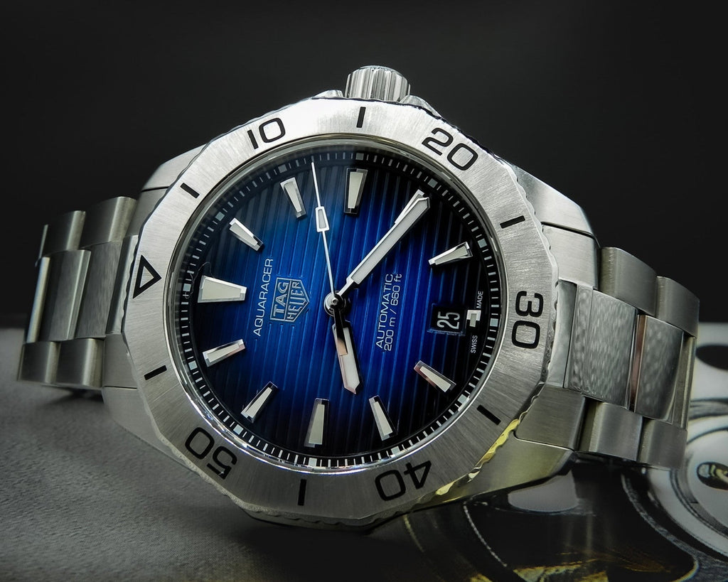 Tag Heuer Aquaracer Calibre 5 has a Stainless steel case with a stainless steel bracelet. Uni-directional rotating stainless steel bezel. Blue dial with luminous silver-tone hands and index hour markers. Minute markers around the outer rim. Dial Type: Analog. Luminescent hands and markers. Date display at the 3 o’clock position. Automatic movement with a 38-hour power reserve.