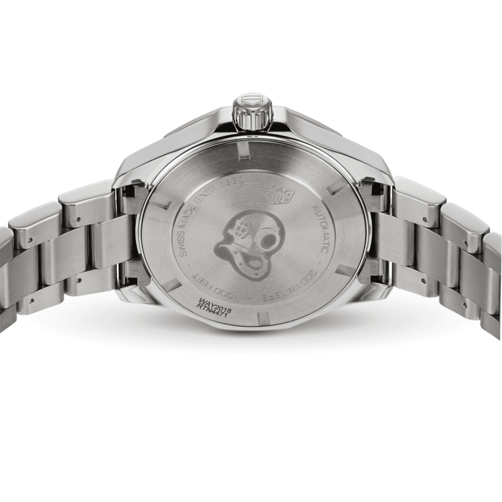 The screw-on case back protects the precise Swiss-made TAG Heuer Calibre 5 movement, vibrating at 28,800 per hour, supplying a power reserve of approximately 38 hours.