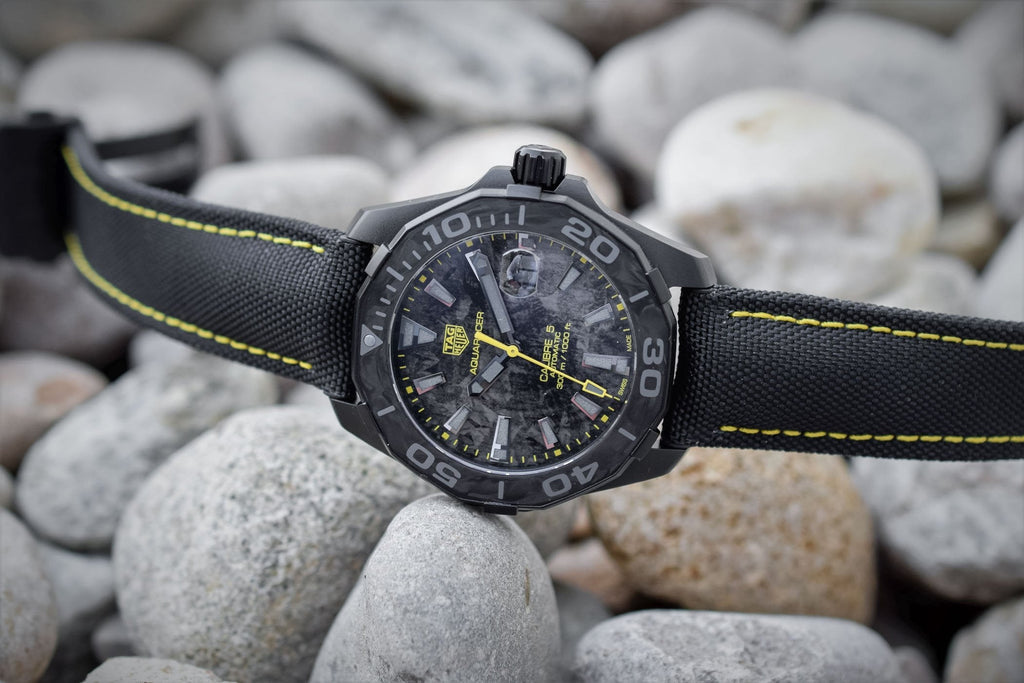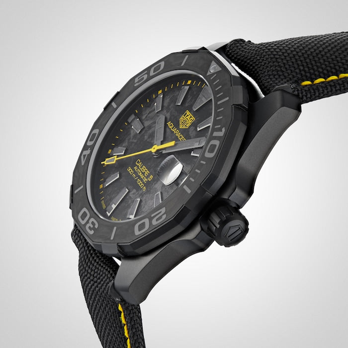 Swiss-made, this bold TAG Heuer Aquaracer is an aesthetic 41 mm watch. This model features a Titanium Carbon case and a Calibre 5 Automatic movement.