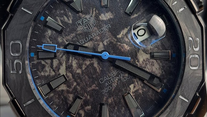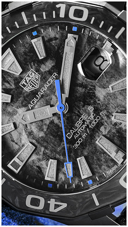 Swiss-made, this bold TAG Heuer Aquaracer is an aesthetic 41 mm watch. This model features a Titanium Carbon case and a Calibre 5 Automatic movement.