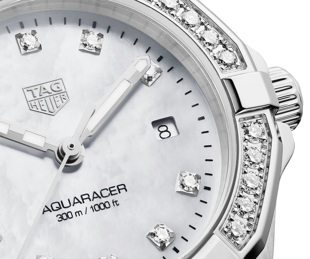 TAG HEUER AQUARACER WBD1415.BA0741 is a diamond-set “bijou” (0.44 CT) with a gorgeous white mother-of-pearl dial. The diminutive and feminine case (27mm) conceals full professional sports assets and is water-resistance to 300 meters. Eleven diamonds shimmer on the beautiful dial. Another 35 adorn the stainless-steel unidirectional turning bezel. The seductive bracelet is stainless steel. Sophisticated and reliable, for confident women with active and playful lifestyles.