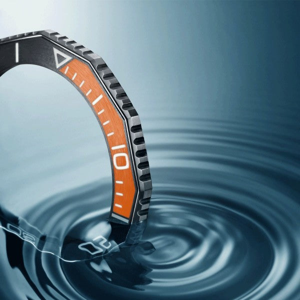 - Black and orange ceramic bezel.