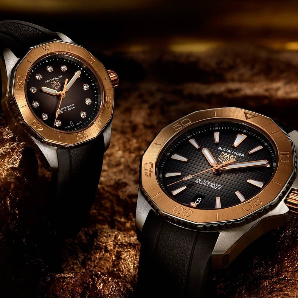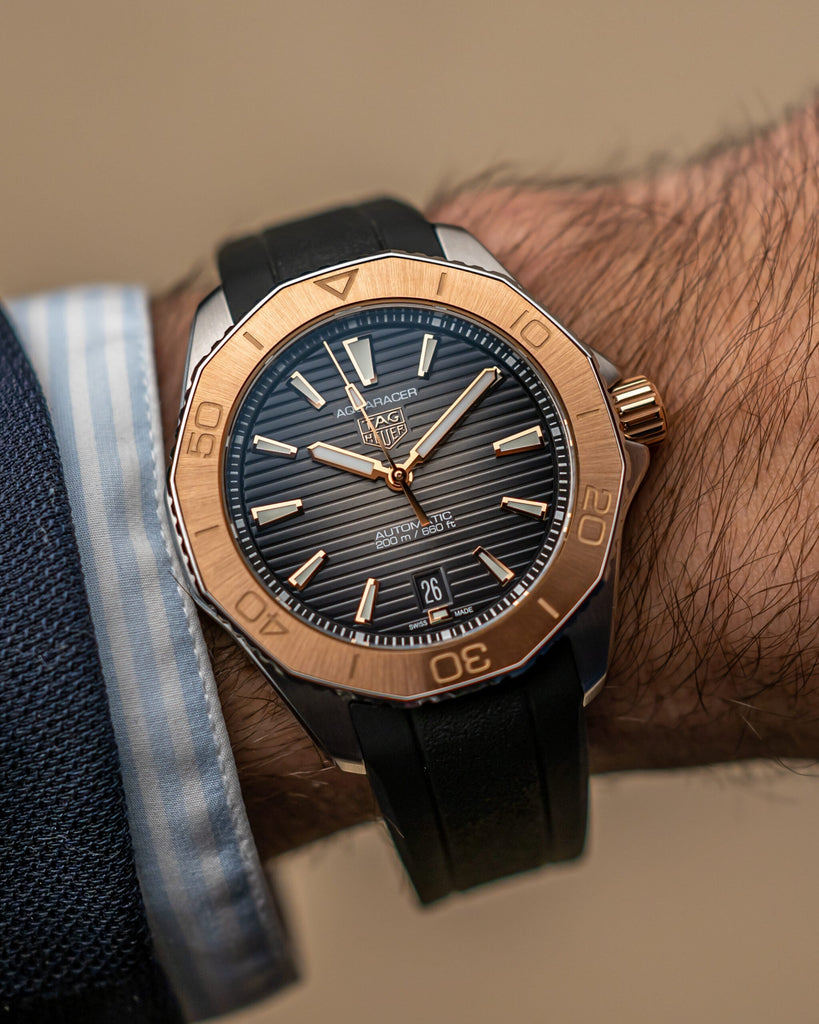 Luxury meets ultra-resistance in this showy TAG Heuer Aquaracer. The 18K 5N rose-gold bezel inlay and screw-down crown stand out next to the smokey-black dial adorned with highly legible hands and markers. A watch geared for every achievement.