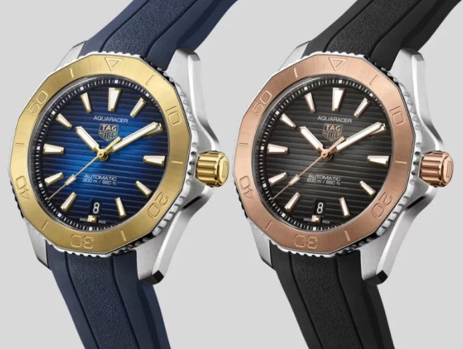 Pairing a striking 18K 5N rose-gold bezel inlay and screw-down crown with a daring fumé black dial, this luxurious TAG Heuer Aquaracer brings high-end materials to the fore. Water-resistant to 200 metres, the 40mm stainless steel case sports a versatile black rubber strap for seamless comfort on all occasions.