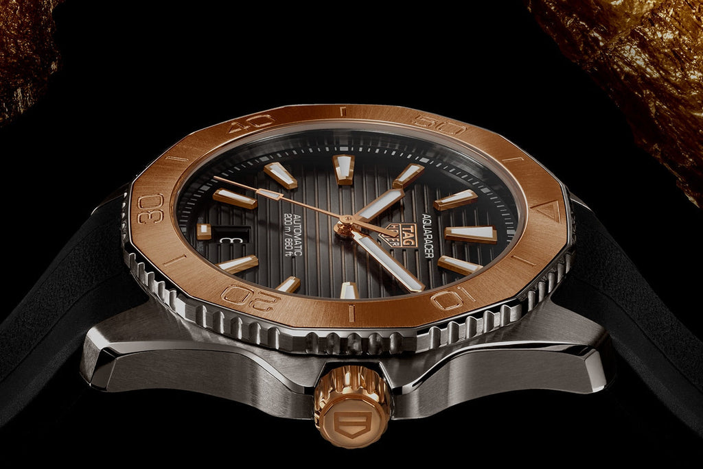 Luxury meets ultra-resistance in this showy TAG Heuer Aquaracer. The 18K 5N rose-gold bezel inlay and screw-down crown stand out next to the smoky-black dial adorned with highly legible hands and markers. A watch geared for every achievement.