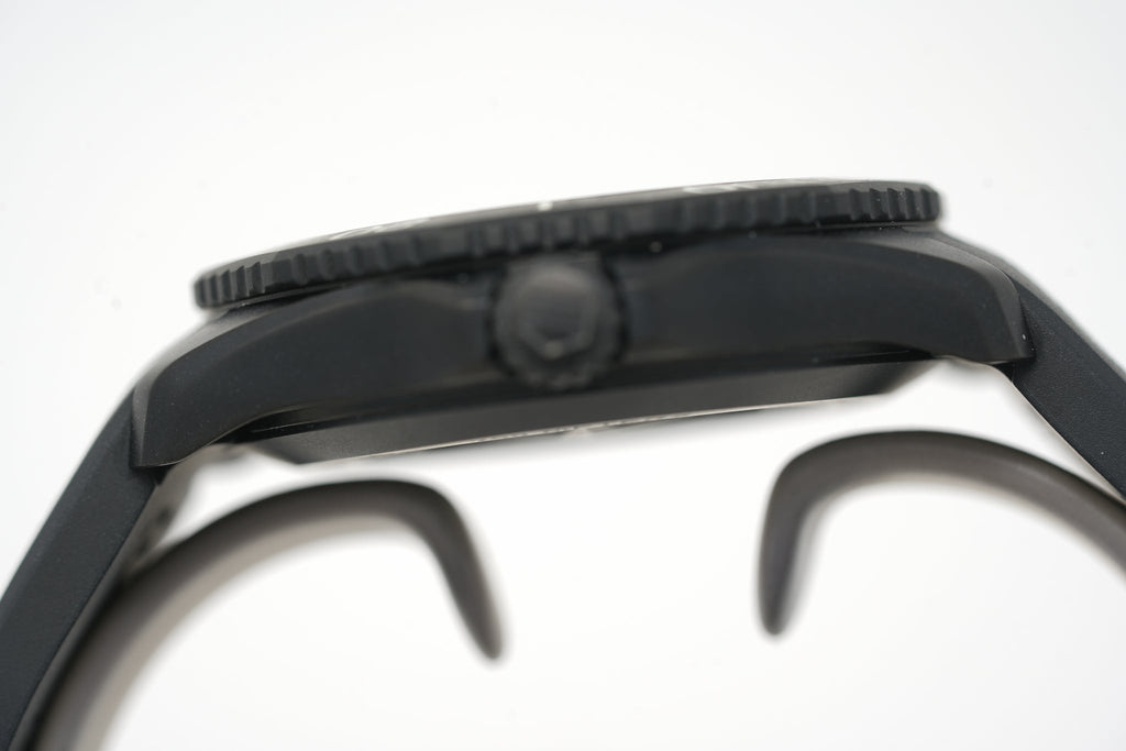 This 40mm model pairs a black DLC-coated stainless steel case with a black rubber strap.