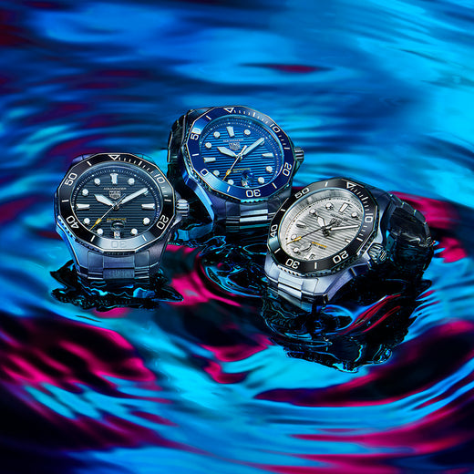 This new special edition TAG Heuer Aquaracer with a vibrant silver sunray brushed dial is a true diving watch. Bold black gold-plated hands and hour markers generously filled with white Super-LumiNova® for unrivalled legibility.