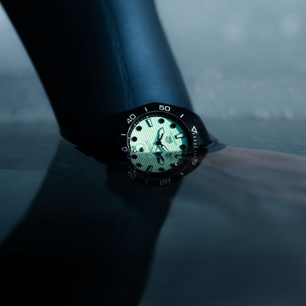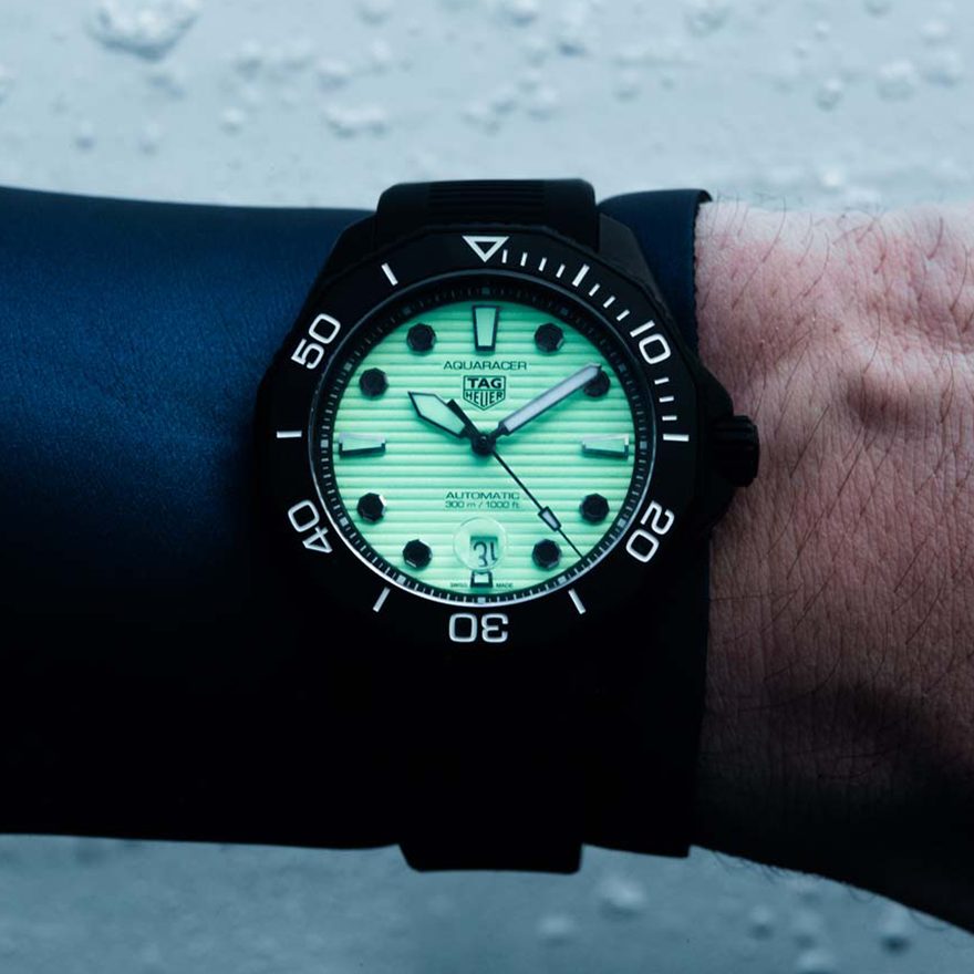 A dive watch with unique style. Bold and stealthy, the automatic Calibre 5-powered Aquaracer Nightdiver dive watch features a 43mm steel case with DLC coating and matching black ceramic bezel. Rugged and reliable in all conditions.