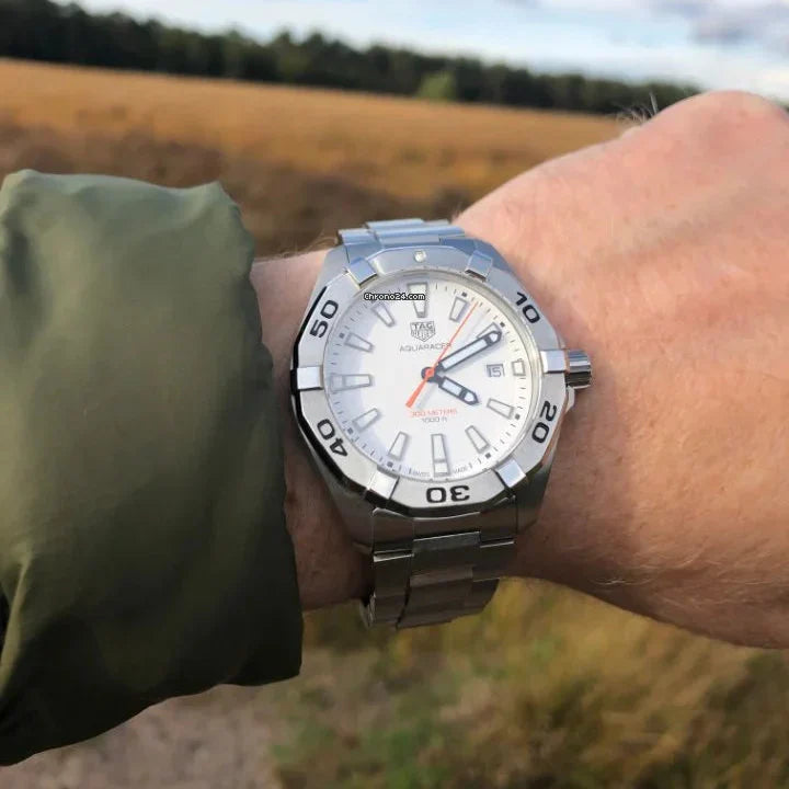 Brand New Authentic Tag Heuer Aquaracer 300M 41MM White Dial Stainless Steel Men's Watch Model WBD1111.BA0928. Stainless Steel case with Silver Stainless Steel Brushed watch band. Folding clasp. Uni-Directional Rotating bezel. Dial description: Luminous hands and Index hour markers with minute markers around the outer rim on a White dial. Quartz movement. Powered by Tag Heuer Quartz engine. Watch functions: Date, Hour, Minute, Second. Screw Down crown. Scratch Resistant Sapphire crystal. Round case shape. Case size: 41mm. Solid case back. 300 Meters - 990 Feet water resistant. 2 year warranty. Also known as model: WBD1111-BA0928.