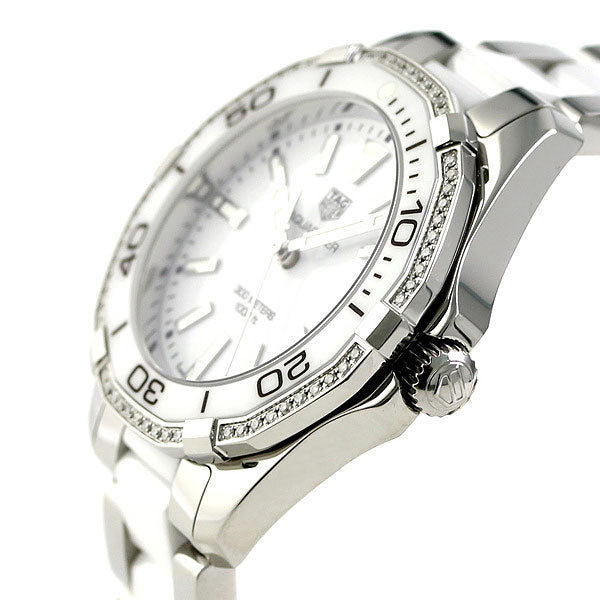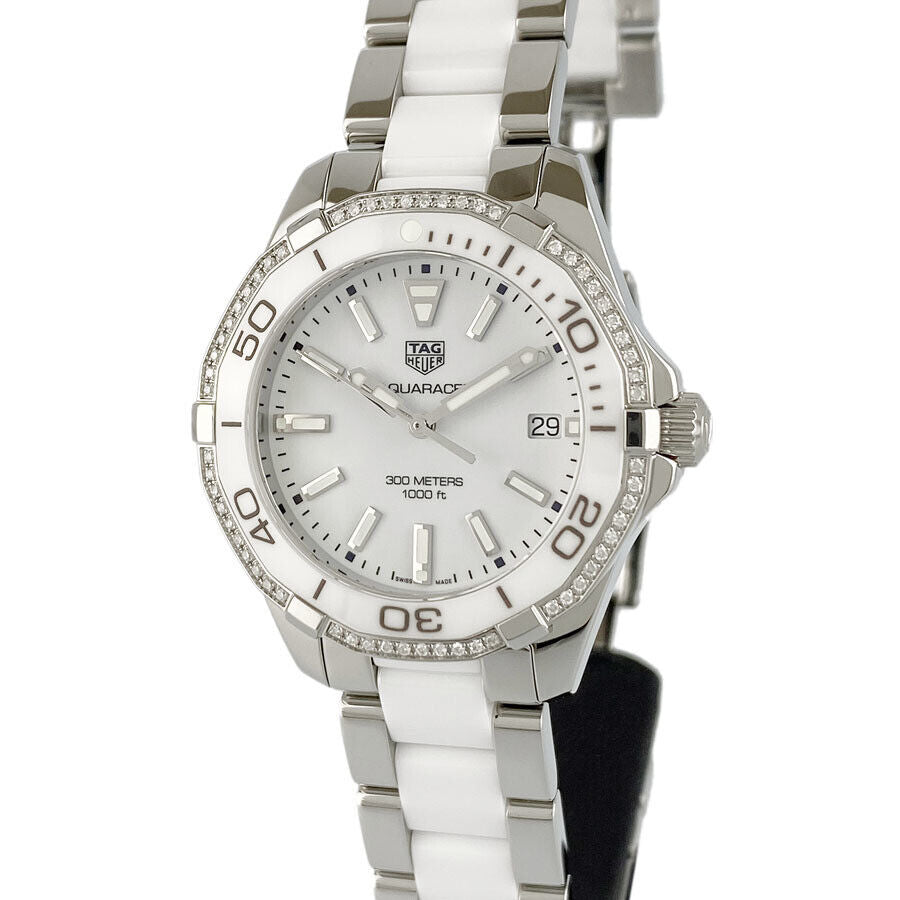 The Tag Heuer Aquaracer Diamonds watch is a stunning timepiece designed for women. It features a luxurious two-tone steel strap, complemented by a white diamond-studded dial. With its precise Swiss quartz movement, this watch is both elegant and reliable. Elevate your style and stay on schedule with the WAY131H.BA0914 model.