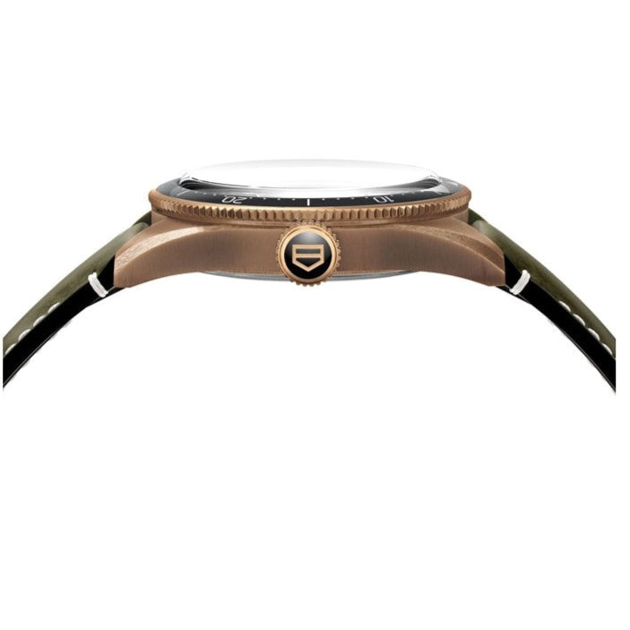 A seriously rugged men’s automatic watch with bronze case and on-trend khaki smoked dial. Inspired by classic explorer’s watches, the design is upgraded by 21st-century materials, including titanium for the case back and black ceramic for the bidirectional turning bezel.