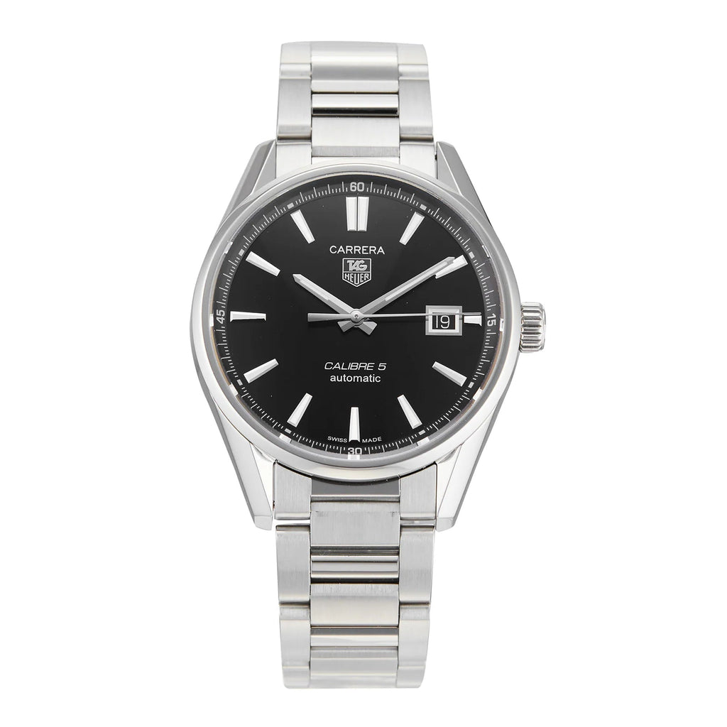 Luxury watches TAG Heuer Carrera Calibre 5 Caliber 5, Automatic, 39 mm. The watch has functions date . Basic parameters of the watch are: dial colour is black, movement type is mechanical watch with automatic winding, strap material is steel and water resistent is 100 m.