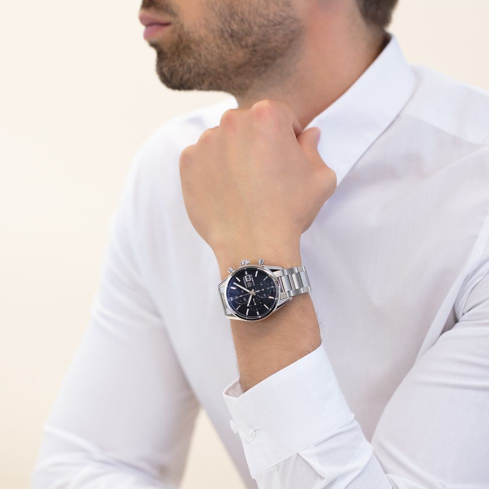 A versatile 41mm TAG Heuer Carrera chronograph with black dial and rhodium-plated steel bracelet. Powered by the robust Calibre 16 automatic movement, it is a very urban, elegant and masculine look.
