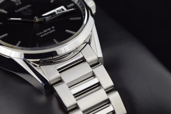TAG Heuer Carrera Calibre 5 Men's Watch WAR201A.BA0723 features a 41mm stainless steel case fitted with a black dial, sapphire crystal glass, and a day-date complication.