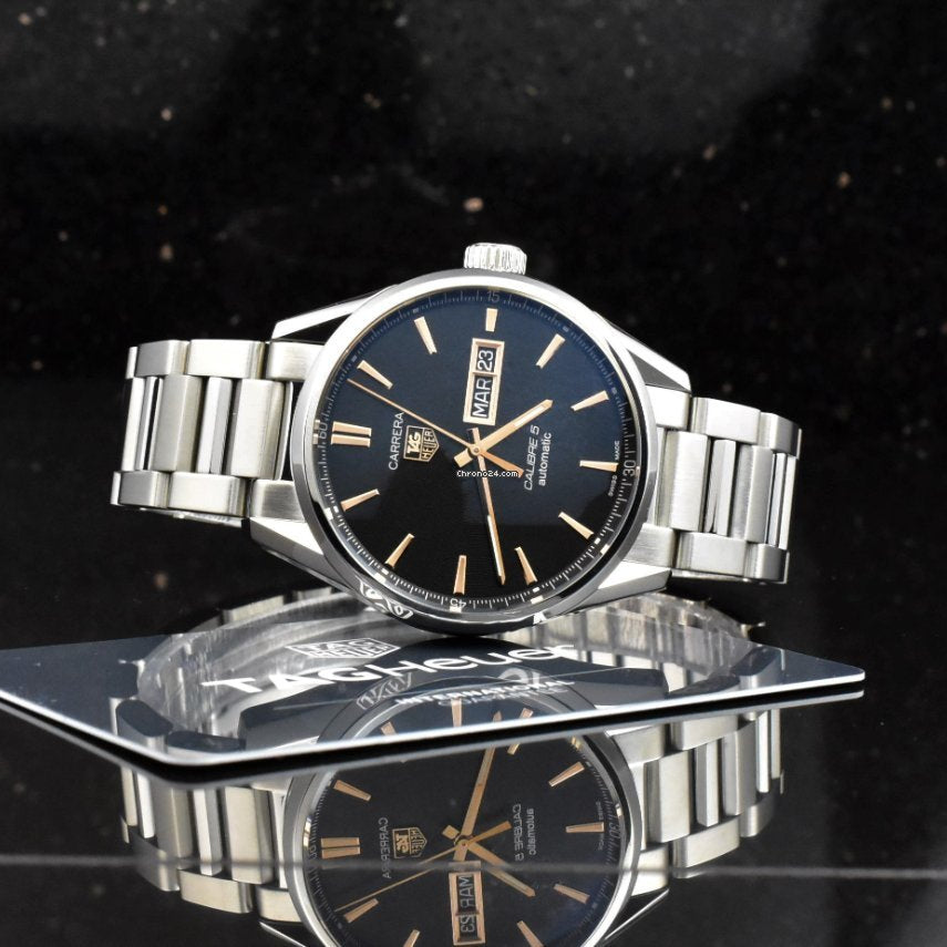 TAG HEUER Carrera Gent’s Watch has a Silver-tone stainless steel case with a silver-tone stainless steel bracelet. Fixed silver-tone stainless steel bezel. Black dial with luminous rose gold-tone hands and index hour markers. Minute markers around the outer rim.