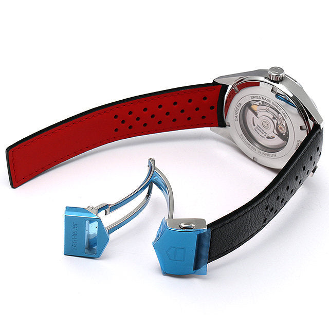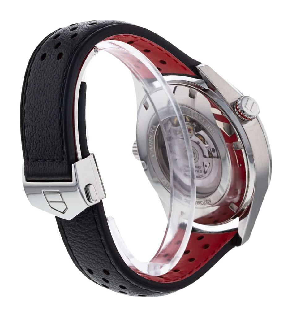 Bring home this magnificent Carrera watch from TAG Heuer. Crafted from stainless steel, this watch comes with a case diameter of generous 43mm. It features a rounded black dial detailed with a date window, Arabic numeral hour markers, minute markers around the outer rim, and three hands. This automatic-powered watch comes fitted with leather straps and secured with clasp closure. It also features a transparent case-back that gives us a glimpse of the intense mechanism.