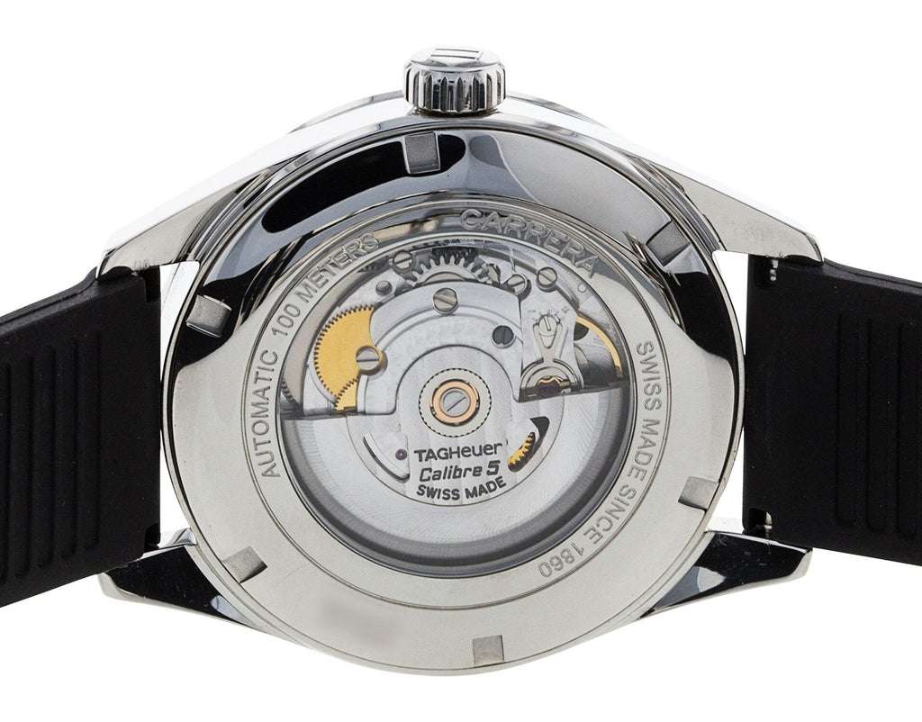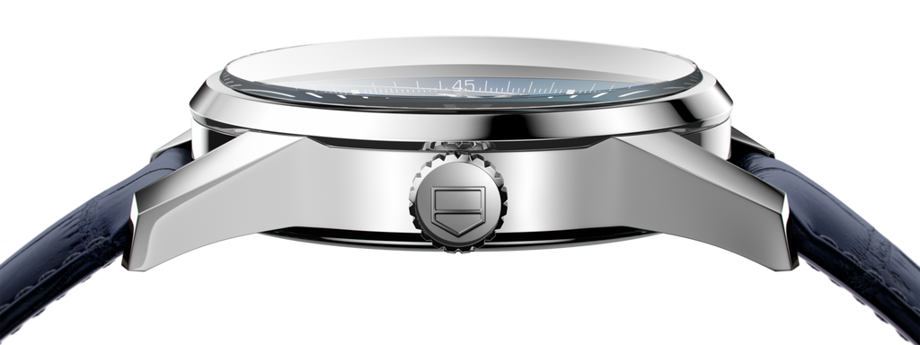 A timeless three-hand TAG Heuer Carrera with an alligator strap and a beautiful sunray blue dial. The day-date window at 3 o’clock stands out on the uncluttered, easy-to-read design.