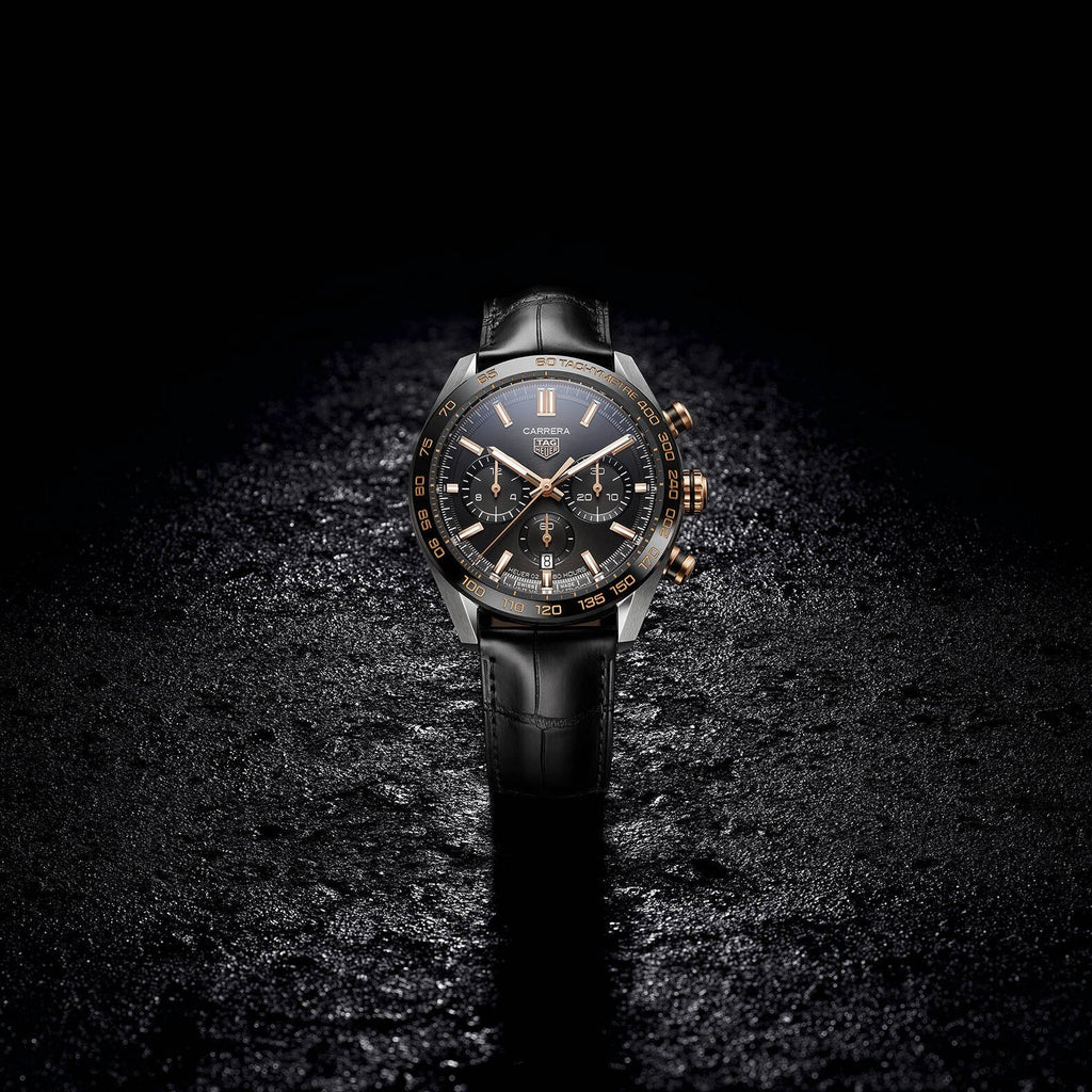In sumptuously chic black and rose gold, this Carrera sets a blistering new pace in prestige timekeeping. Housed in a 44-mm steel polished, fine brushed case, the legendary Calibre HEUER02 Automatic movement now comes outfitted with splendid finery.