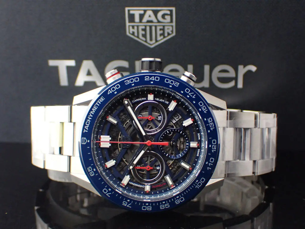 An assertive, 45mm TAG Heuer Carrera in stainless-steel with blue dial and fixed blue ceramic bezel. The expansive face shows off the intricately skeletonized dial, technical art of work for this in house manufacture movement.