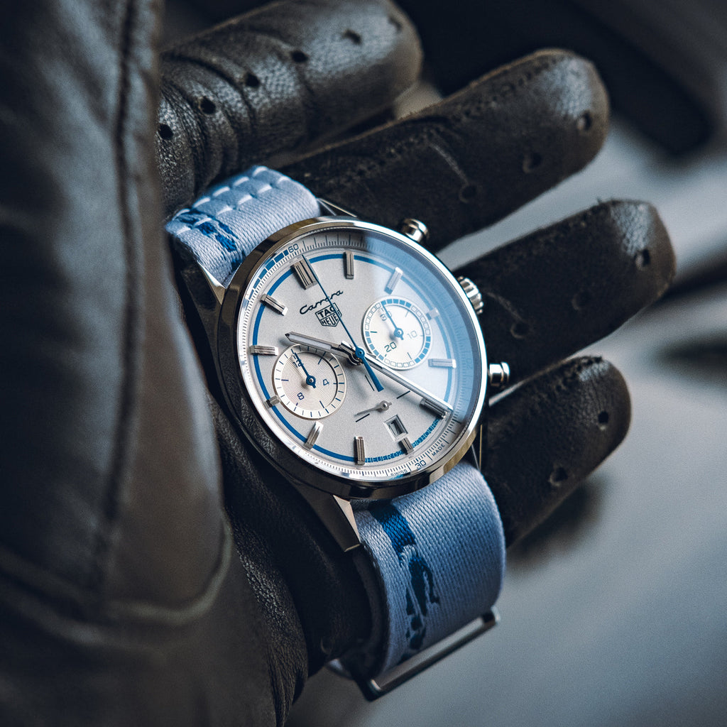 Inspired by the instantly recognisable, mythical Porsche, the crisp white dial is accented with vibrant blue details and further accented by bold Carrera branding.