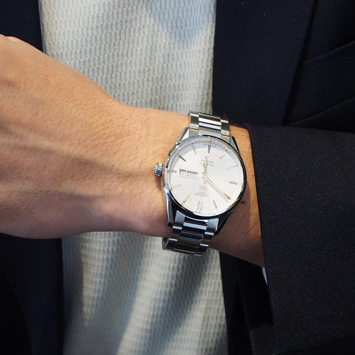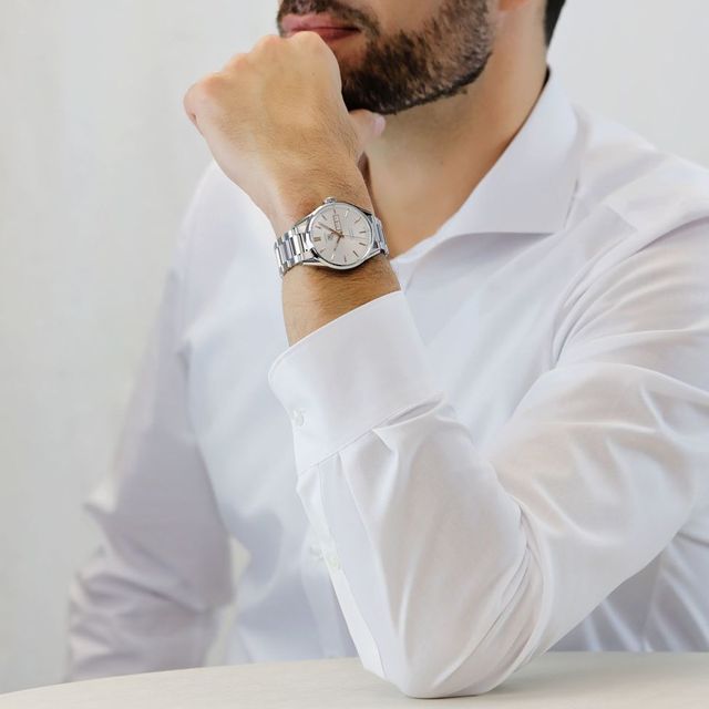 - Silver dial with rose gold-tone hands and index hour markers