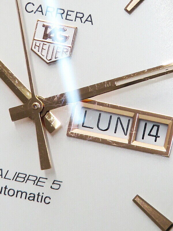 Rose-gold elements on the white dial design including the hands, the polished, hand-applied TAG Heuer shield, the angled day-date window at 3 o’clock and the polished baton-shaped indexes.