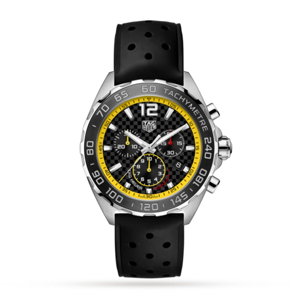 - Black dial enhanced by luminous silver-tone hands. Silver-tone stainless steel case with a black (perforated) rubber band. Quartz movement. 200 meters / 660 feet water resistance. Fixed bezel. Scratch Resistant Sapphire crystal. Solid caseback. Tang clasp. Screw Down crown. Case size 43 mm x 11.5 mm. Band 22 mm x long. Tag Heuer CAZ101AC.FT8024 Formula 1 Watch