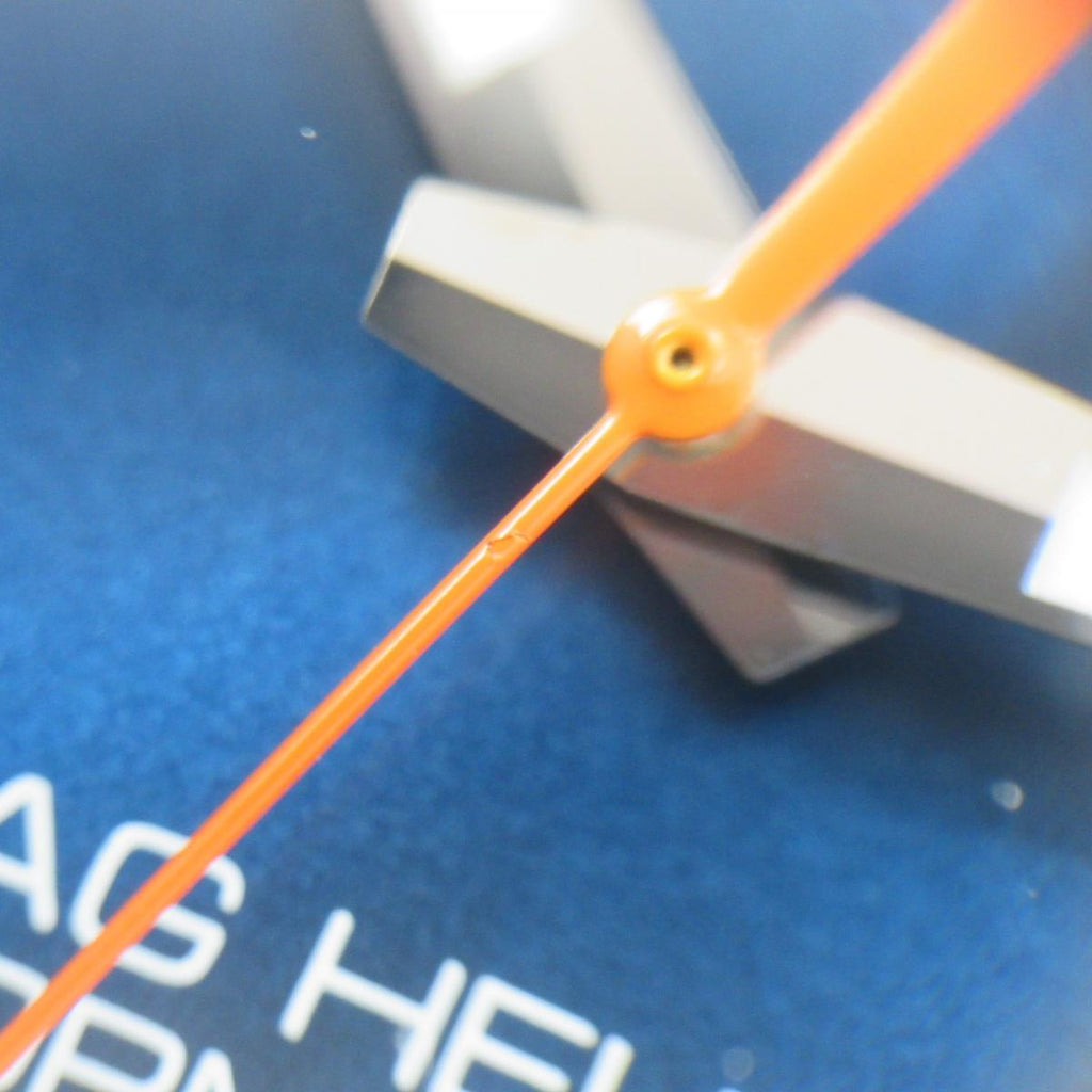 A bold 43mm stainless steel case is at the centre of this model. The bright blue unidirectional rotating bezel frames the eye-catching dial beautifully, while luminescent markers display the time and the date window sits precisely at three o’clock. The distinctive black and blue striped strap completes the look.