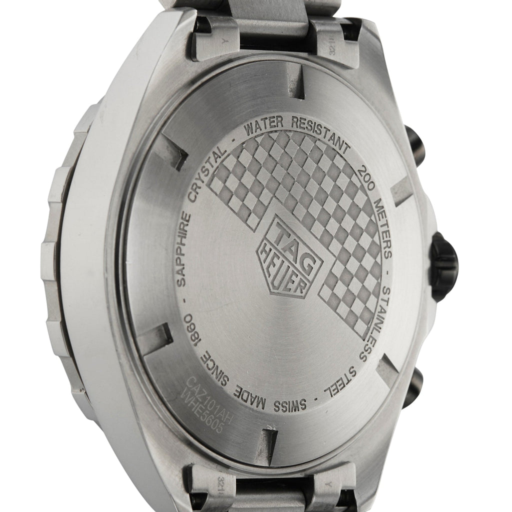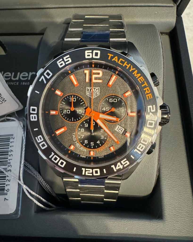 Adorned with a chequered flag caseback, a reliable Swiss made quartz movement is sealed behind a strong piece of steel and powers on relentlessly. The TAG Heuer Formula 1 watch measures a confident 43mm diameter and features a fixed black ceramic bezel with vibrant orange accents marking out its tachymeter scale.