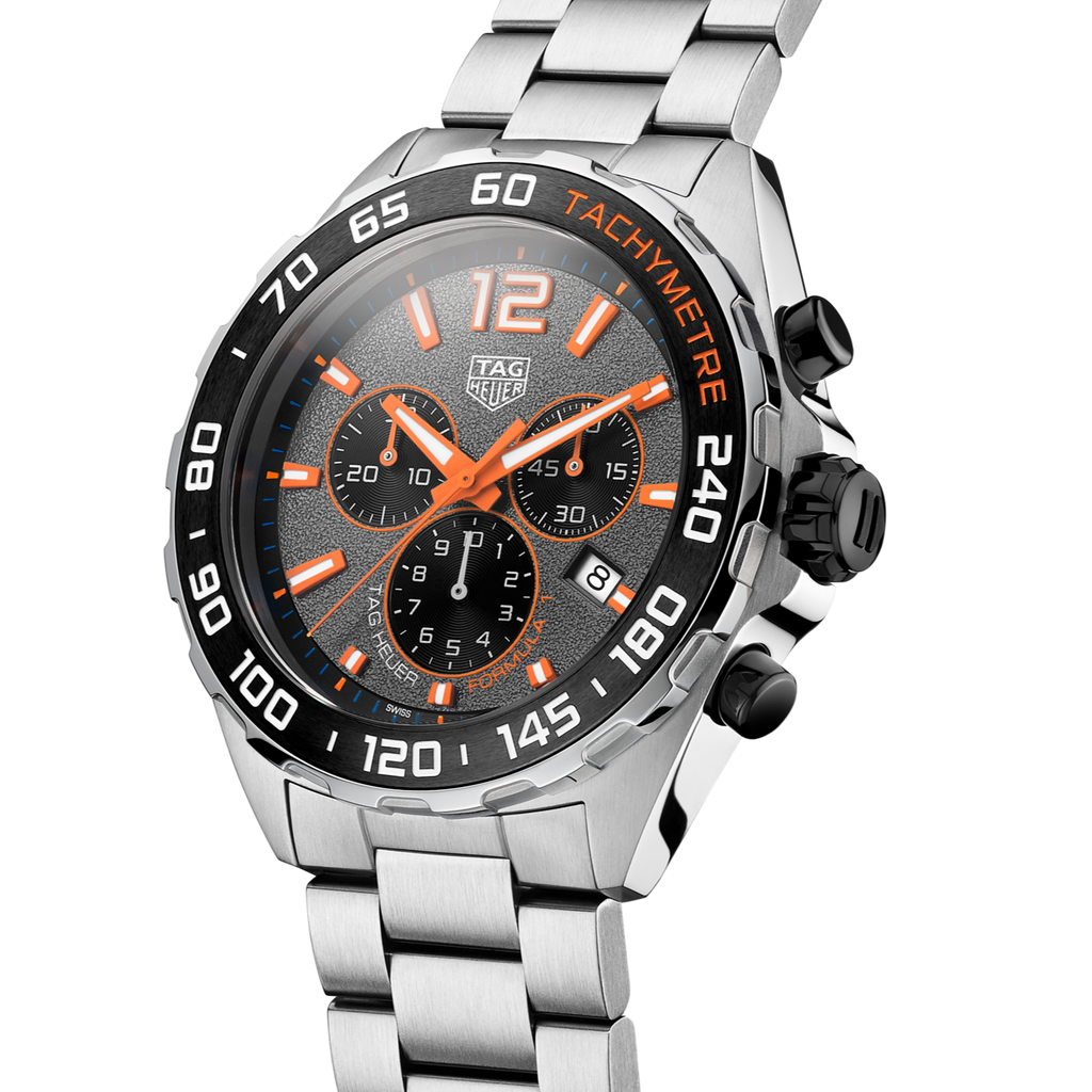 The action ready TAG Heuer Formula 1 Quartz Chronograph watch, with its stunning asphalt pattern dial contrasted by bold orange accents, is a timepiece to wear whether on the side of the race track or in the driver’s seat. Its robust, masculine architecture is forged from brushed and polished stainless steel with black PVD coated accents seen in the crown and chronograph push pieces.
