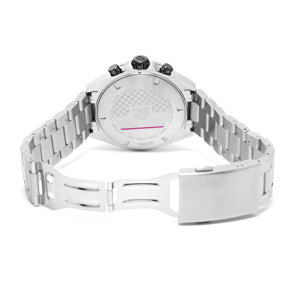 The Formula 1 watch by TAG Heuer completes its adrenaline infused look with a rugged stainless steel bracelet. A steel folding clasp with double safety system secures the brushed links to the wearer’s wrist comfortably, whilst a diving extension facility enables the watch to be worn over a wetsuit whenever desired.
