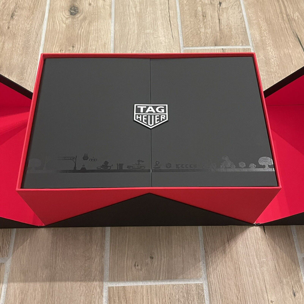 Brand New Authentic Tag Heuer Formula 1 Limited Edition Mario Kart Black Dial Leather Strap Men's Watch Model CAZ201E.FC6517. Brushed and Polished Stainless Steel case with Black Leather strap. Folding clasp. Fixed Ceramic bezel. Dial description: Silver tone luminous hands and Index hour markers with minute markers around the outer rim and 3 Sub-dials on a Black dial. Automatic-Chronograph movement.