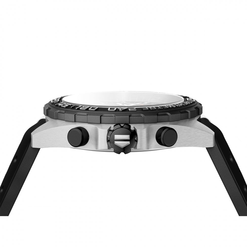 The 43mm brushed steel case is fitted with a flat, virtually scratch-proof sapphire crystal. Pushbuttons at 2 o’clock and 4 o’clock are black PVD treated, as is the steel screw-down crown at 3 o'clock. “Easy Grip” finishes make all three easy to use, even when wearing racing gloves.