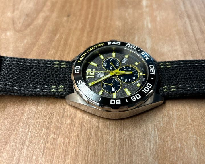 Matching the dial and bezel a high quality textile strap with eye-catching lime yellow accents, secured by a pin buckle for comfort on the race track.