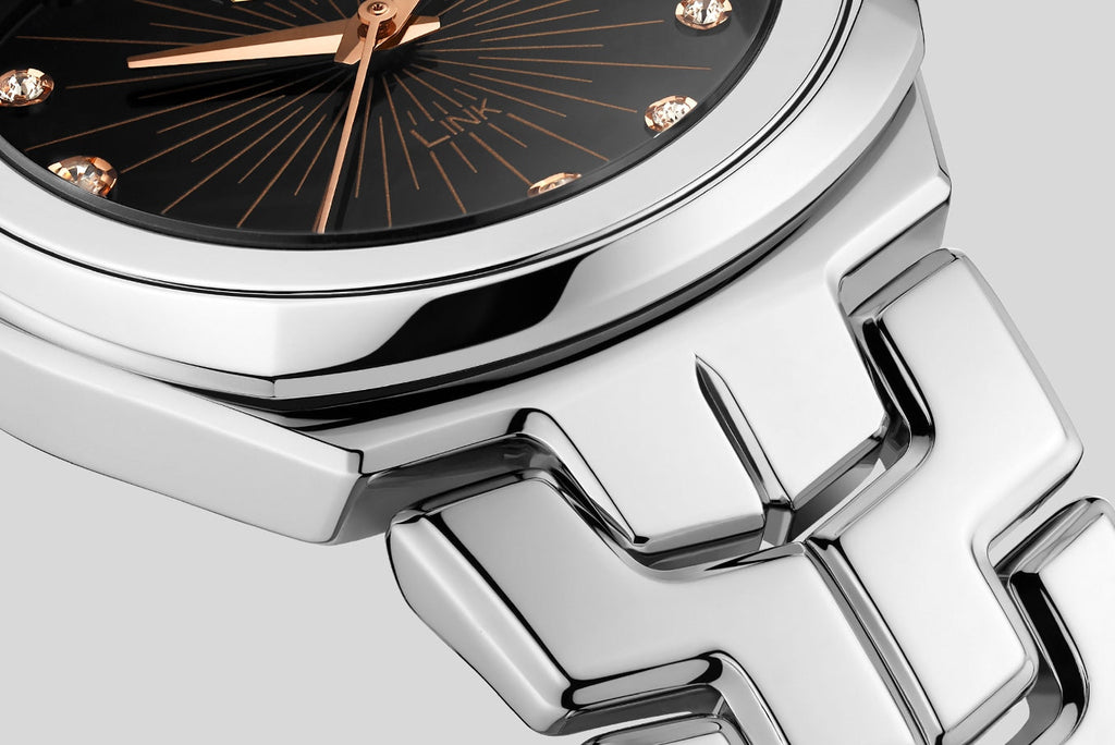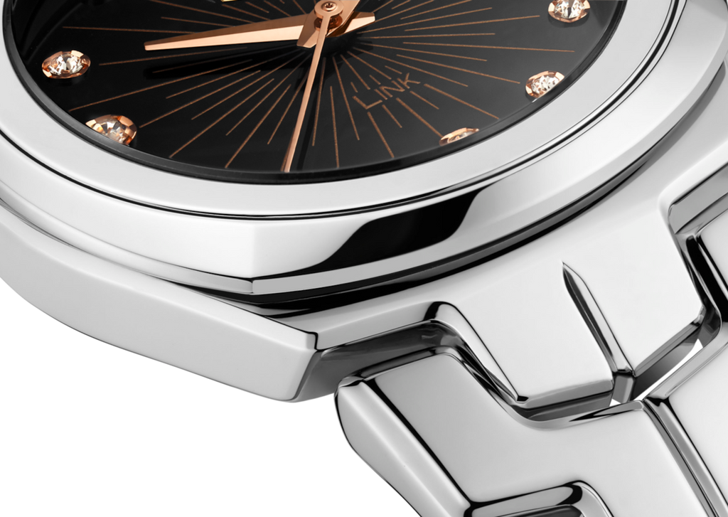 Glamour and elegance merge in this 32mm TAG Heuer Link. In addition to its iconic S-shaped bracelet, this watch has a sparkling black dial and index with diamonds (0.16 ct). The TAG Heuer logo, as well as the hands, have a rose gold finish.