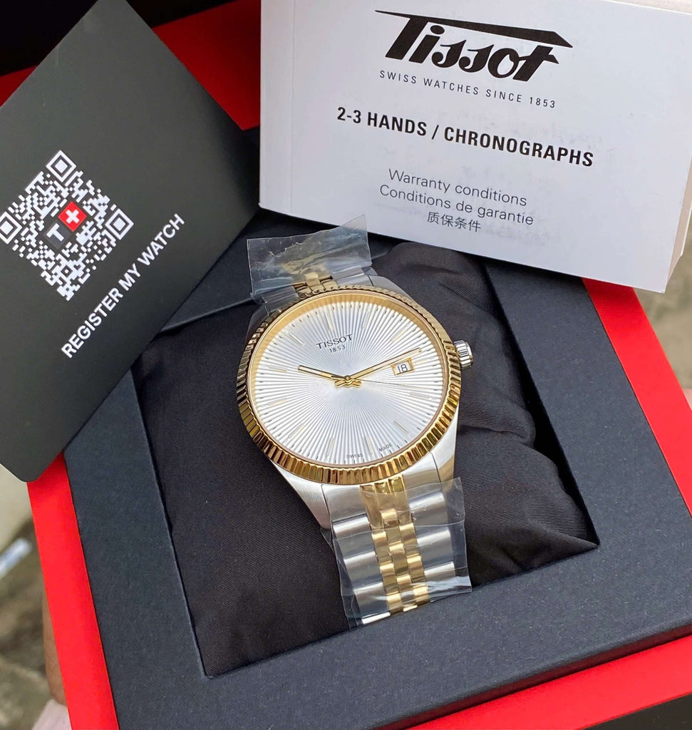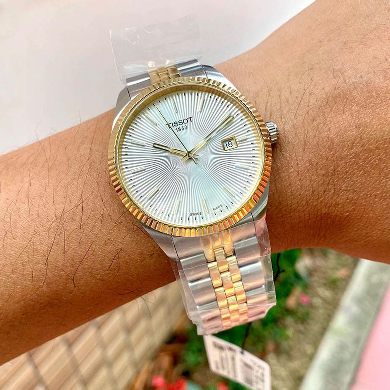 Tissot T156.410.22.031.00 Ballade Metal Band Men Watch. The case is made out of silver stainless steel with a gold bezel, which stands for the high quality of the item, it has a white color dial. This model has got 100 meters of water resistance. it can be worn in scenarios where it is likely to be splashed but not immersed in water and will be fine in rain. The watch is shipped with an original box