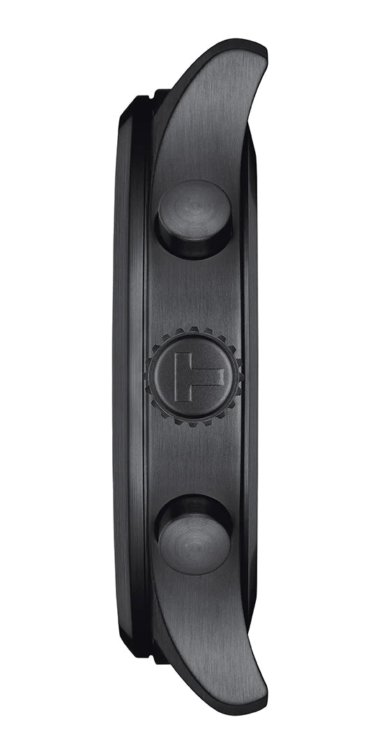 Black PVD stainless steel case with a black leather strap. Fixed black PVD stainless steel bezel. Black dial with black hands and Arabic numeral hour markers. Arabic numeral minute markers (at 5 minute intervals). Dial Type: Analog. Chronograph - three sub-dials displaying: 60 second, 30 minute and 1/10th of a second. ETA Caliber G10.212 quartz movement. Scratch resistant sapphire crystal.