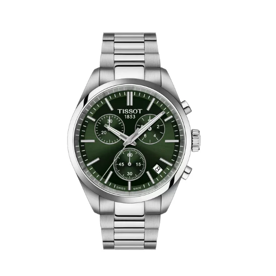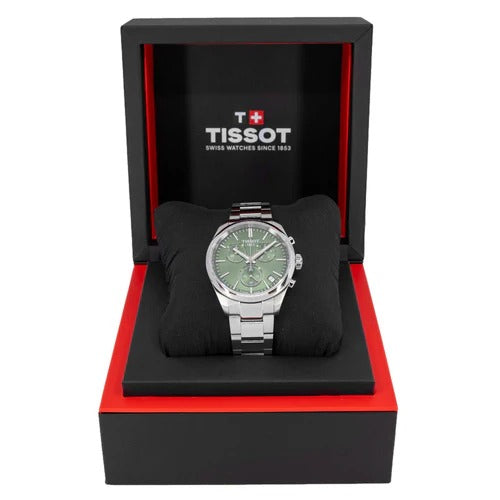 The Tissot PR 100 Chronograph combines Swiss precision with contemporary style. Featuring a striking green dial that commands attention, this timepiece showcases a polished silver steel case and matching bracelet for a refined aesthetic. The chronograph function delivers practical timing capabilities, while the robust construction ensures durability for everyday wear and special occasions alike. Powered by reliable Tissot engineering, this watch represents the perfect balance of sophistication and functionality for the discerning gentleman.