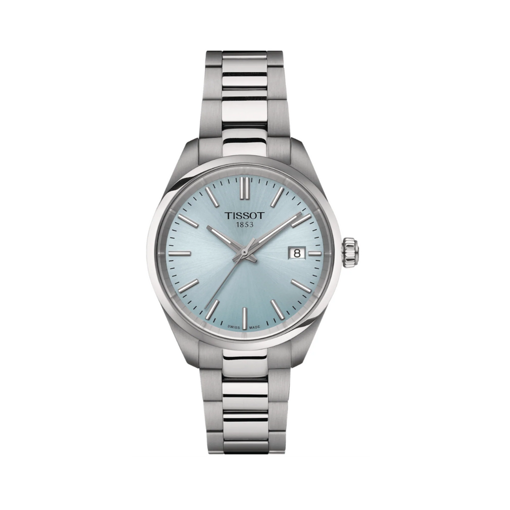 Elegant sophistication meets everyday reliability with the Tissot PR 100 Ice Blue Dial. This women's timepiece features a stunning ice blue dial that captures light beautifully, paired with a polished silver steel bracelet for a refined aesthetic. The 36mm case houses Swiss quartz precision, ensuring accurate timekeeping for years to come. Water-resistant to 100 meters, it's ready for daily wear and light water activities. The classic design transcends trends, making it a versatile companion for both professional and casual settings. A timeless investment piece that combines Tissot's heritage of Swiss watchmaking excellence with contemporary style.