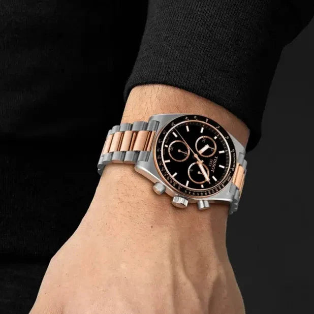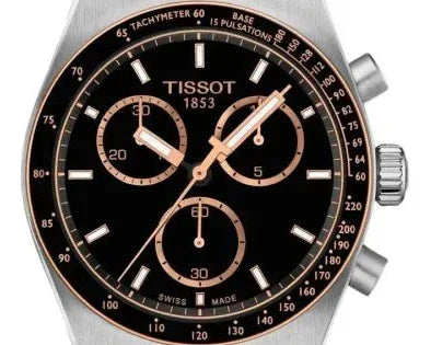 The Tissot PR516 Chronograph combines Swiss precision with timeless elegance. Featuring a striking black dial and two-tone stainless steel construction, this men's chronograph delivers both style and functionality. The robust steel strap ensures durability for everyday wear, while the chronograph subdials provide practical timing capabilities. Built on Tissot's heritage of watchmaking excellence, the PR516 is engineered for those who appreciate refined craftsmanship and reliable performance. A sophisticated choice for professionals and watch enthusiasts alike.