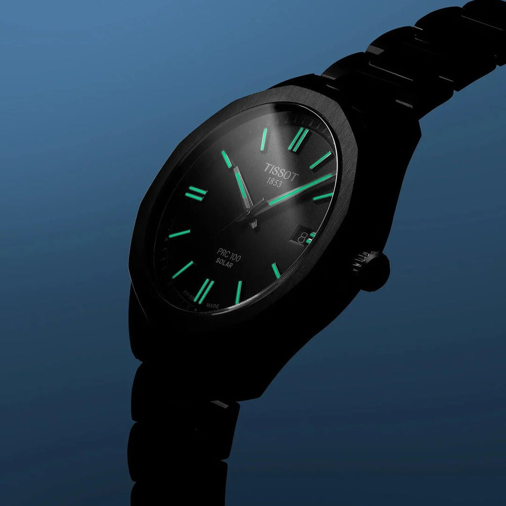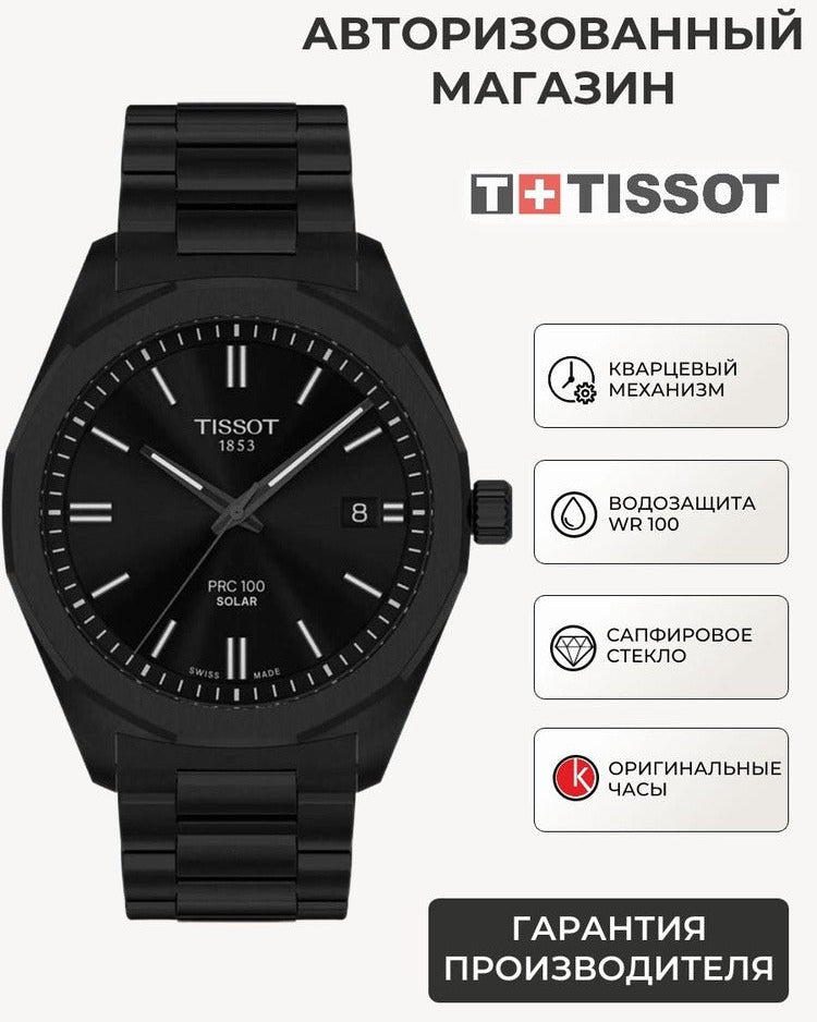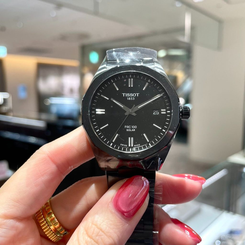 The TISSOT PRC 100 Solar Quartz 39mm commands attention with its sleek black dial and bold design. Powered by solar quartz technology, this watch combines precision with eco-friendly innovation. Its robust 39mm case ensures durability while making a striking statement on your wrist.