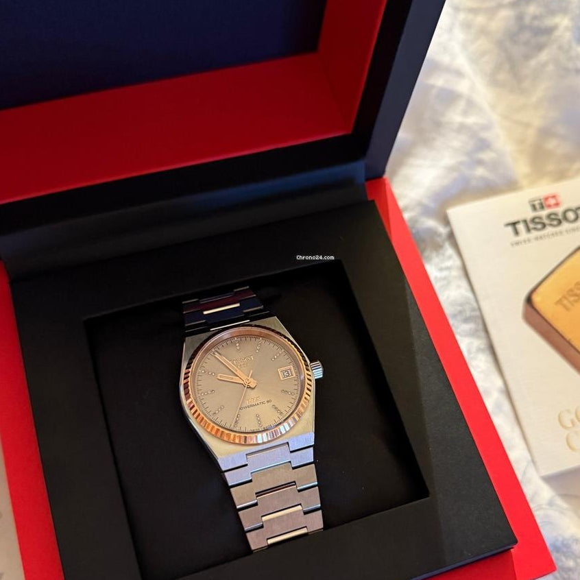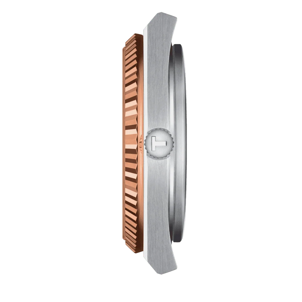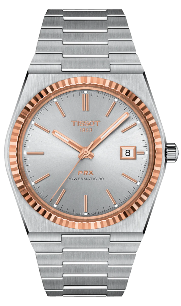 A practical watch that captures the distinctive style of the 70s. The perfect watch for retro design lovers. The PRX Powermatic 80 men's wristwatch . The movement23 stones, frequency21,600 vibrations per hour. 80-hour power reserve. Patented Nivachron balance spring. Steel case with a satin-finished finish.BezelMade of 18k rose gold. Applied hour markers in the form of dashes. Hands and hour markers withfluorescentA coating that glows in the dark after a short charge in the light. A date window is located at the 3 o'clock position. A fluted crown. A transparent case back. A reliable steel bracelet with a folding clasp and a systemquick replacement.