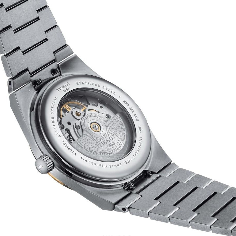 Part of the T-CLASSIC Collection, the PRX Series from the Tissot Watch Brand has sleek , smooth designs inspired by 1970's style, with modern innovations. The PRX Powermatic 80, (just as implied in its namesake) is a Swiss Automatic movement with an impressive 80-hour power reserve viewable behind an exhibition case-back. Model #T931.407.41.031.00 has a brushed and polished two-tone 40mm stainless steel tonneau shaped case with a silver sun-brushed dial.