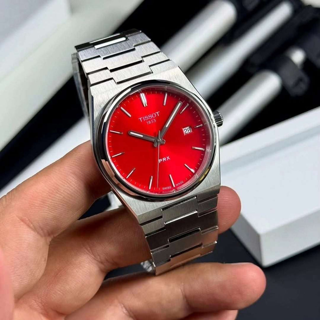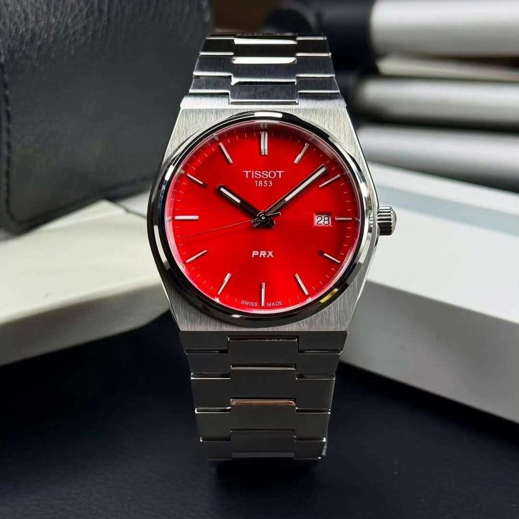 The Tissot PRX Quartz 40mm with its striking red dial commands attention with bold elegance. Crafted for men who dare to stand out, this watch combines precise Swiss quartz movement with a sleek, modern design. Its robust 40mm case and vibrant color make a powerful statement on the wrist, perfect for those who embrace confidence and style every day.