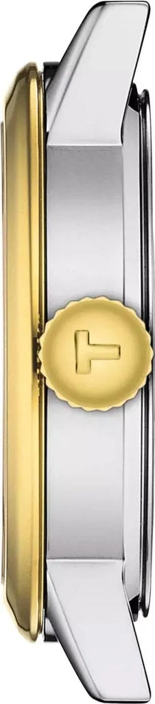Brand New Authentic Tissot Classic Dream Lady Silver Dial Two-Tone Steel Women's Fashion Watch Model T129.210.22.031.00. Brushed and Polished Stainless Steel case with Polished Yellow Gold PVD Coated Stainless Steel Two-Tone Bracelet watch band. Brushed and Polished Stainless Steel Deployment with Push Button clasp. Smooth. Yellow Gold PVD Coated Stainless Steel bezel. Dial description: Polished Yellow Gold Tone Hands and Stick Hour Markers with Minute Markers Around the Outer Rim and the Date at 3 o'clock on a Silver dial.